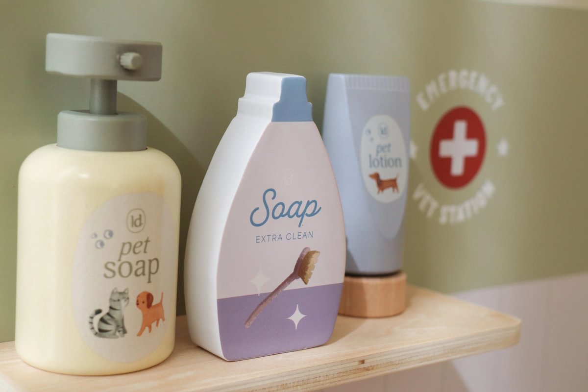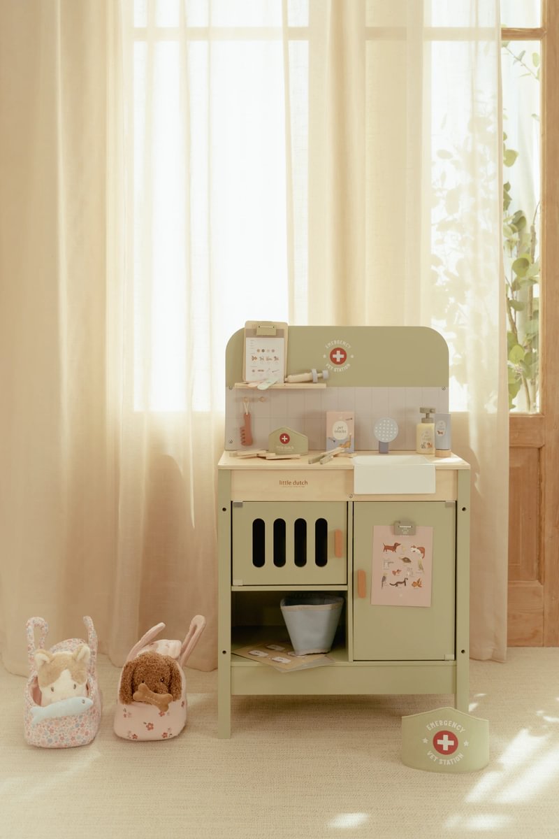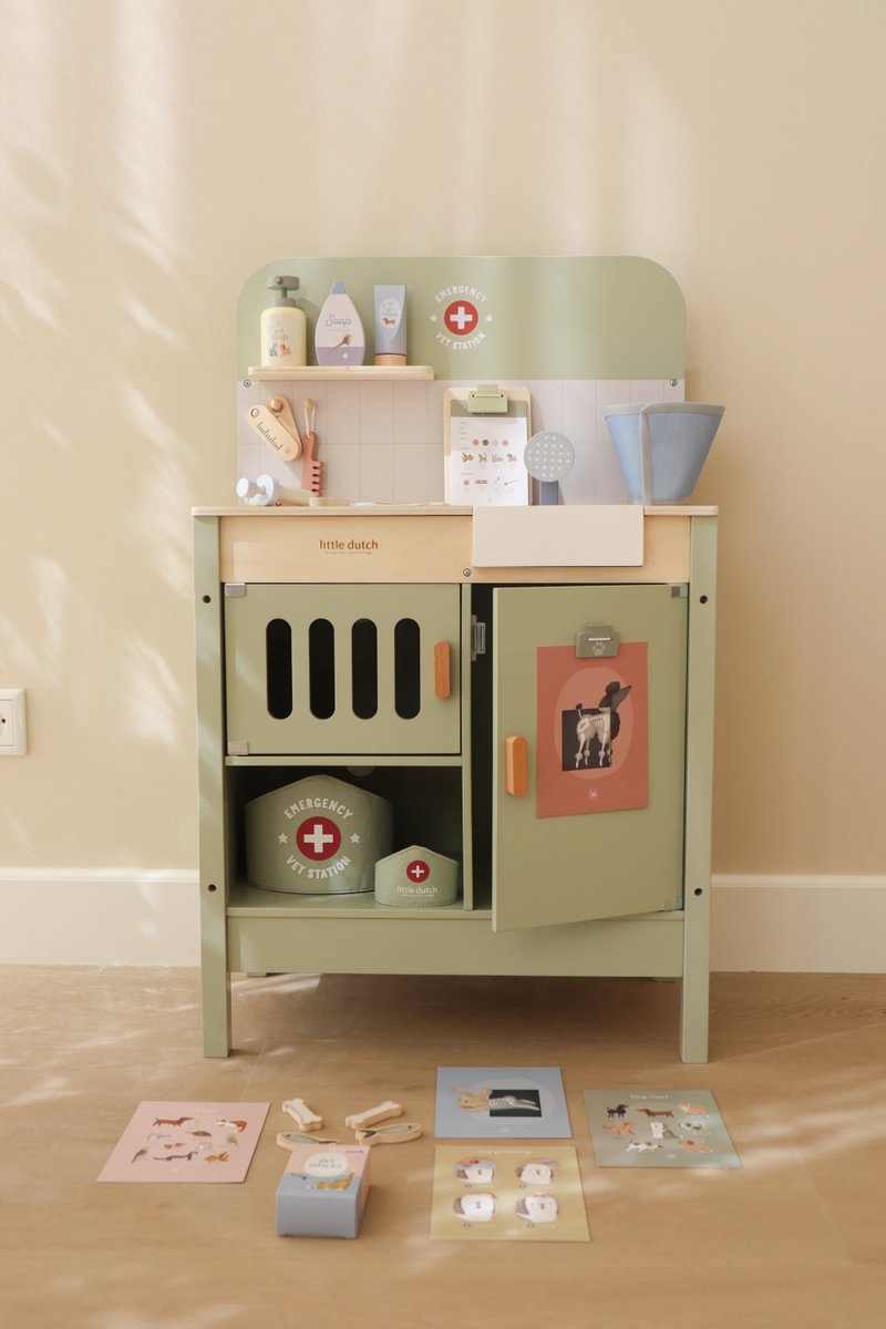 Ezzel a színes, fából készült állatorvosi rendelővel a kicsi teljesen elmerülhet az igazi állatorvosi feladatokban. A készlet mindent tartalmaz, ami a háziállatok gondozásához szükséges, például egy kihúzható zuhanyfejet mosdókagylóval, fésűt, hőmérőt, fecskendőt és ragtapaszt. Ezenkívül egy szövet fejpánt és egy speciális csíptető is tartozik hozzá, amelyre orvosi illusztrációkat és röntgenfelvételeket lehet felakasztani.