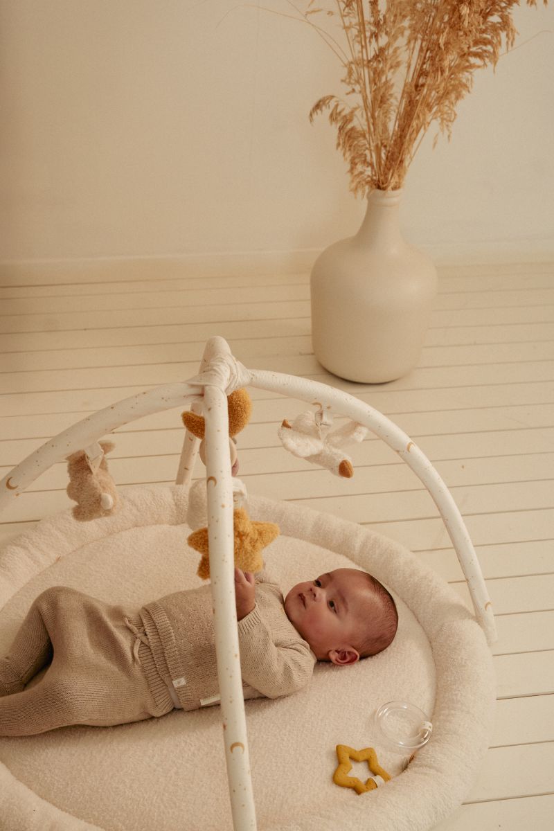 Ez a puha, steppelt, kerek játékszőnyeg remek játékteret biztosít a pici számára. A hidakon függő vidám formák arra ösztönzik a babát, hogy megérintse és felfedezze őket: ehhez nyújtózkodni fog, amivel nagyszerűen fejlődik az izomzata, erősödnek a végtagjai és a finomodik a mozgáskoordinációja. A játékok levehetők, így a baba a babakocsiban is játszhat velük.