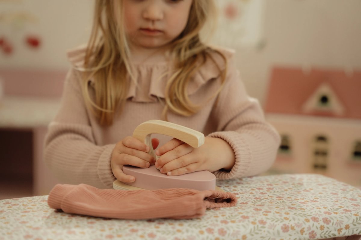 A Little Dutch fa vasalódeszka és vasaló szettje lehetővé teszi a gyermekek számára, hogy utánozzák a felnőttek napi tevékenységeit. A készlet tartalmaz egy összecsukható vasalódeszkát és egy vasalót, amelyek segítenek a finommotoros készségek fejlesztésében és a szerepjátékok során a szociális készségek erősítésében.