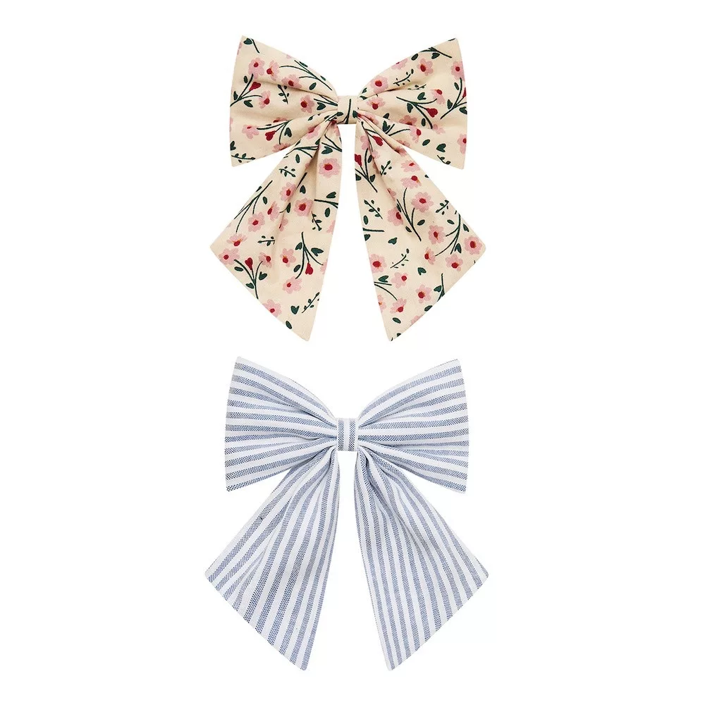A csodaszép masnis hajcsatok friss, szezonális megjelenésüknek köszönhetően tökéletessé teszik az ünnepi frizurát! Ez a bájos páros egy apró virágmintás és egy kék-fehér csíkos masnit tartalmaz, amelyek tökéletesen felfrissítik a hajkiegészítő kollekciót.