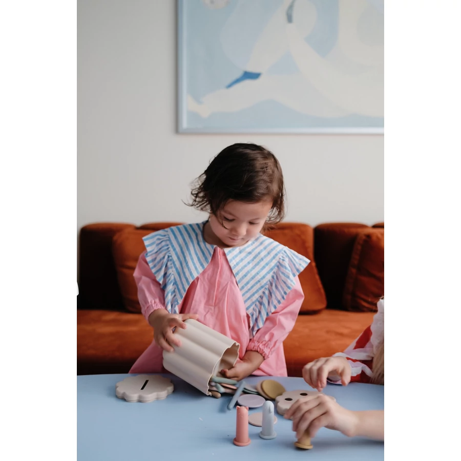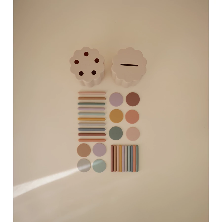Ez a formabedobó szett megismerteti a gyerekeket a különböző formákkal és színekkel, hiszen 20 különböző érme és pálcika is található benne.