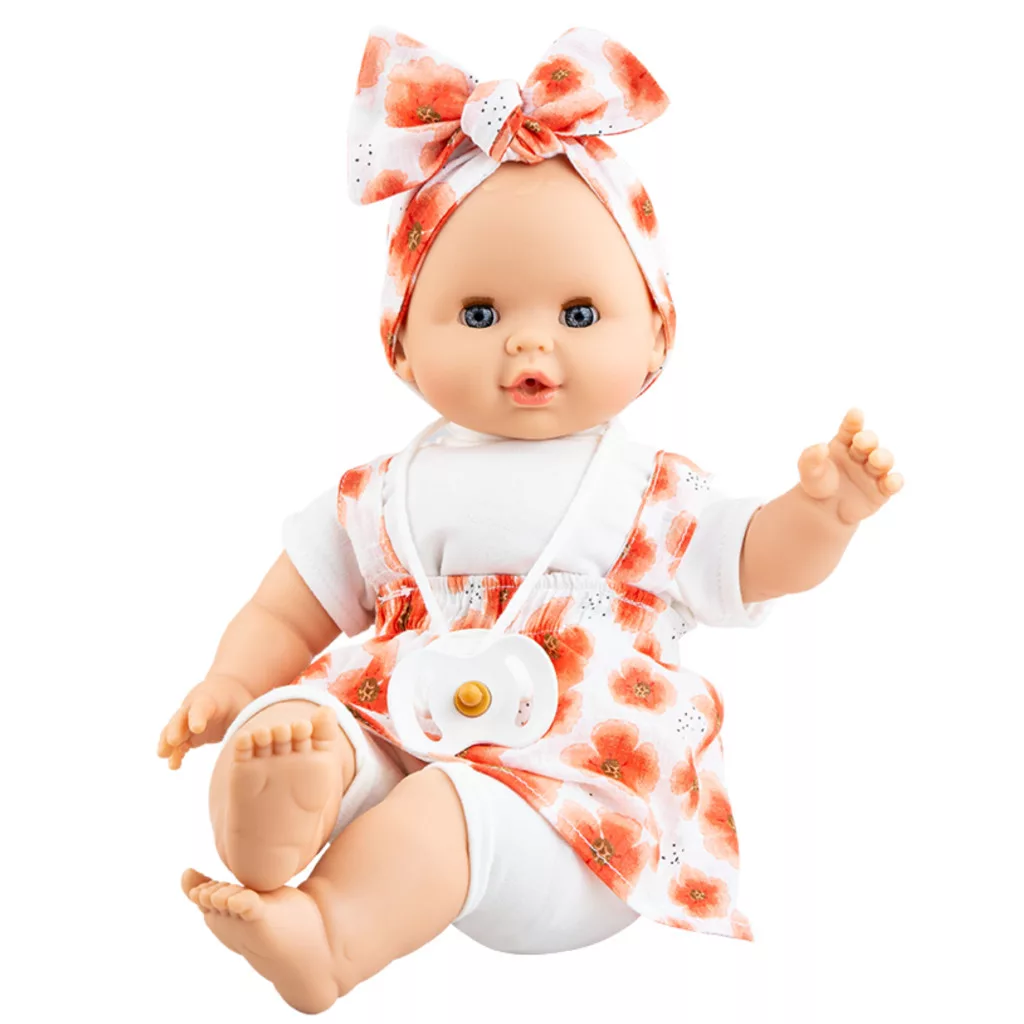 Kedves arcú csecsemő játékbaba. Finom illata és puha teste ölelni való kedvenccé teszi! A babázás segíti az érzelmi fejlődést, a szociális készségek kialakulását és hozzájárul kognitív képességek fejlesztéséhez. Babázás közben a kreativitás, képzelet is szárnyalhat, ezenkívül a beszédfejlődésre is pozitív hatást gyakorol. A kisbaba csinos ruhája levehető, így az öltöztetés gyakorolható rajta.