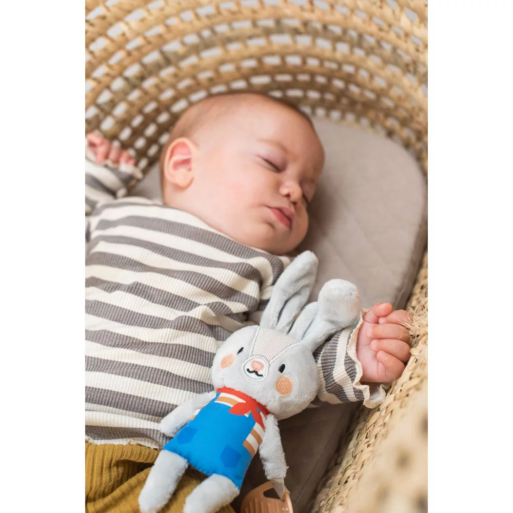 Aranyos nyuszi csörgő rágókával, ami megkönnyíti a baba fogzását. Könnyen feltehető babakocsira, bébihordozóra vagy kiságyra.