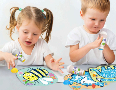 Készíts aranyos mintás képeket a varázsnyomda segítségével. Pontozó mozdulatokkal színezd ki a képek üres felületeit és figyeld, ahogy a minták előtűnnek a háttérből.